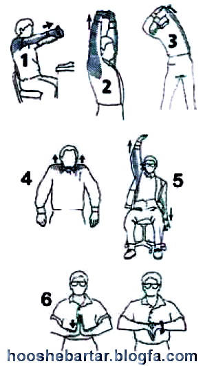 حرکت اول را مطابق شکل می بینید. در این حرکت، کمر را به حالت قائم در آورید. حال دست ها را از پشت گره کنید. سپس با حرکت فنری هر دو دست سعی کنید کشش متعادلی را در عضلات پشت بازو و ساعد خود پدید کورید. این حرکت را 10 مرتبه و در 3 مرحله متوالی با فواصل یک دقیقه انجام دهید.