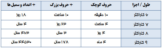 پسوردها و مدت زمانی که یک کامپیوتر نیاز دارد تا یک پسورد را حدس بزند نشان داده